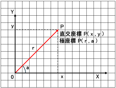 直交座標(x,y) を極座標(r,a) に、極座標(r,a)を直交座標(x,y)に変換します。