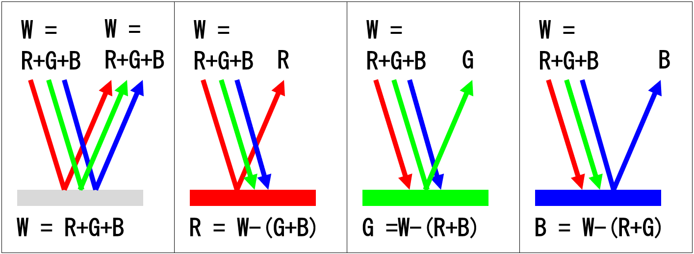 色材に光の三原色で作った白色光を当てた場合の光と反射と吸収の関係を示します。