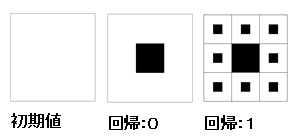 正方形を基本図形として、正方形を9つの合同な部分正方形に分割し、 ちょうど各辺が3分割されるようにし、中央の部分正方形を取り除きます。 残った8つの正方形に対して、 上記の手順を無限に繰り返すと、穴だらけの正方形になります。